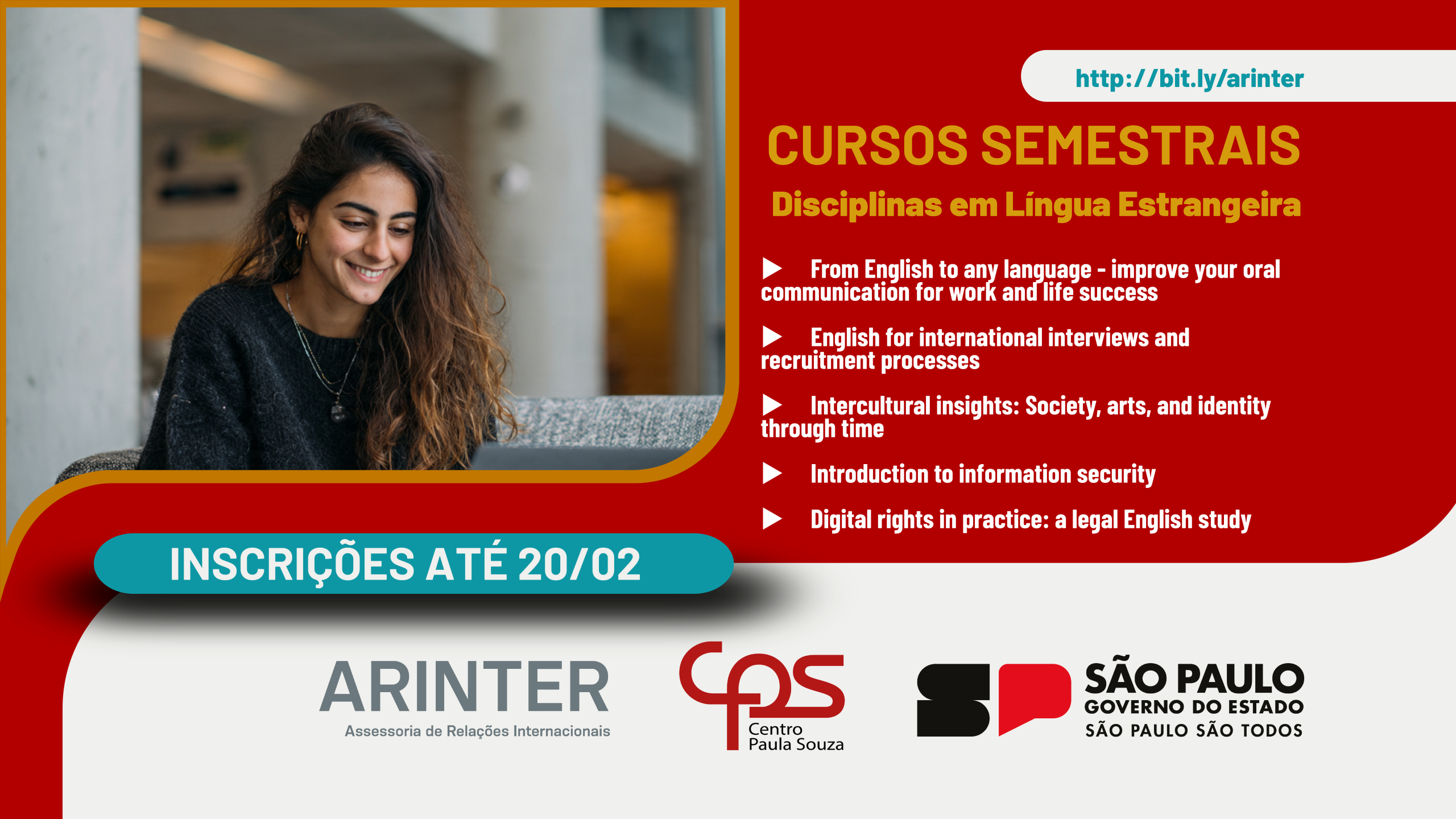 A Assessoria de Relações Internacionais do Centro Paula Souza (ARInter/CPS) informa que estão abertas as inscrições para as Disciplinas em Língua Estrangeira – edição 2026, destinadas a estudantes regularmente matriculados nos cursos de graduação das Faculdades de Tecnologia do Estado de São Paulo (Fatecs).