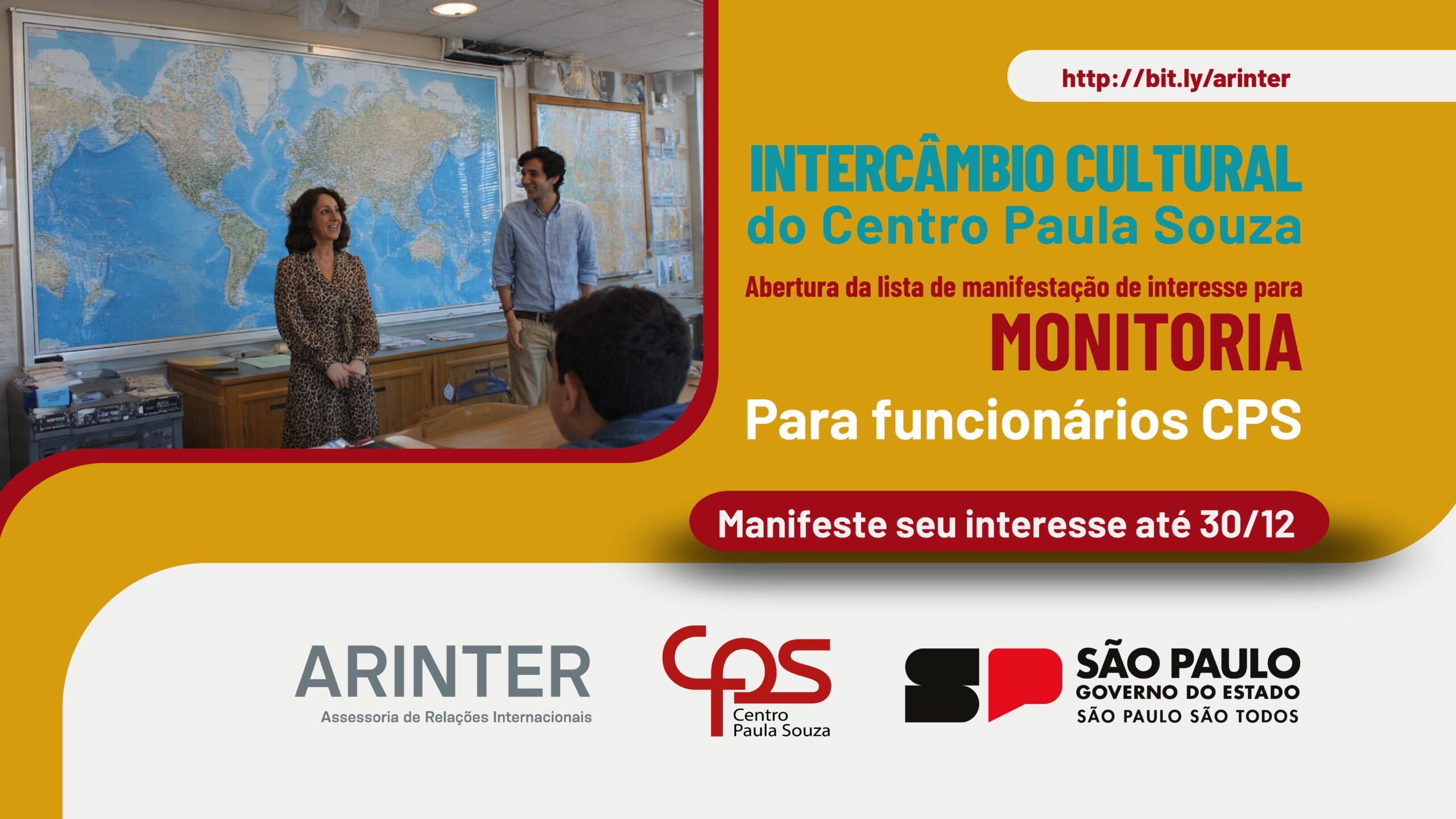 O Centro Paula Souza, por meio de sua Assessoria de Relações Internacionais – ARInter, abre a lista preliminar de manifestação de interesse para docentes e servidores que desejam atuar como monitores do Intercâmbio Cultural 2025, acompanhando grupos de estudantes durante o programa internacional.
